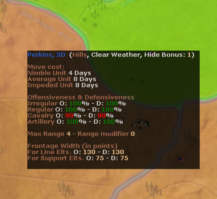 "Offensiveness and Defensiveness" in the terrain menu affect the combat values of the intended element types. So in the pic, cavalry are only at 90% in hills with harsh weather.