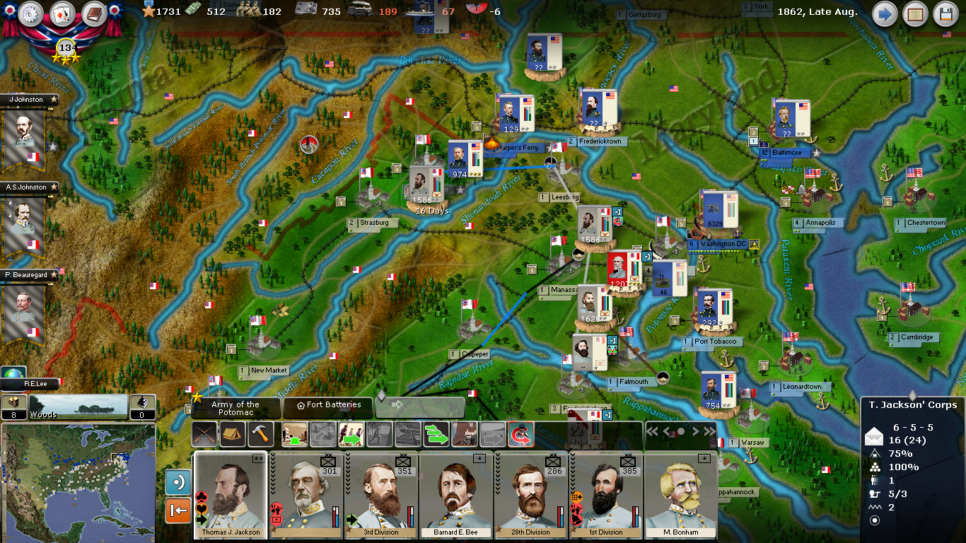 In my current campaign the A.I has been aggressively trying to capture the Valley since early 1861 and Jackson's Corps has been busy keeping them out. Defending the Valley eventually opened up up an opportunity for me to break the stalemate at Manassas and capture Arlington. I sent Jackson to Harper's Ferry behind the Federals to try and trap them there but they responded with a very large force and I had to pull back. After a large battle in Arlington they have sent more troops into the Valley. The low combat frontage has allowed Jackson's Corps to pin down substantially larger forces giving me the time I need to rail in reinforcements formed in other states. I have made it a priority to keep my rail pool strong so I can bring in brigades from as far away as Texas and Louisiana to the front in Virginia.