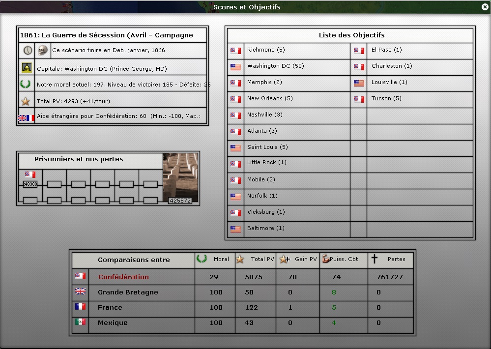 En effet, j'ai moi aussi beaucoup de peine à dépasser les 50 en intervention étrangère là où dans AACW j'arrivais rébulièrement à 70/75.A mon avis, il est inutile de gaspiller des ressources à faire basculer l'intervention étrangère en sa faveur. J'ai mené en MN (pas en PV) toute la partie et j'ai fini à -42. J'étais déjà toujours sur la corde raide en terme de finances donc impossible de dépenser 150.000$ sur un embargo du coton pour un résultat qui n'aurait absolument rien changé !