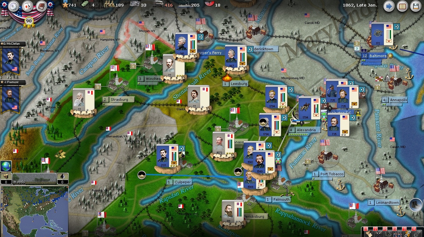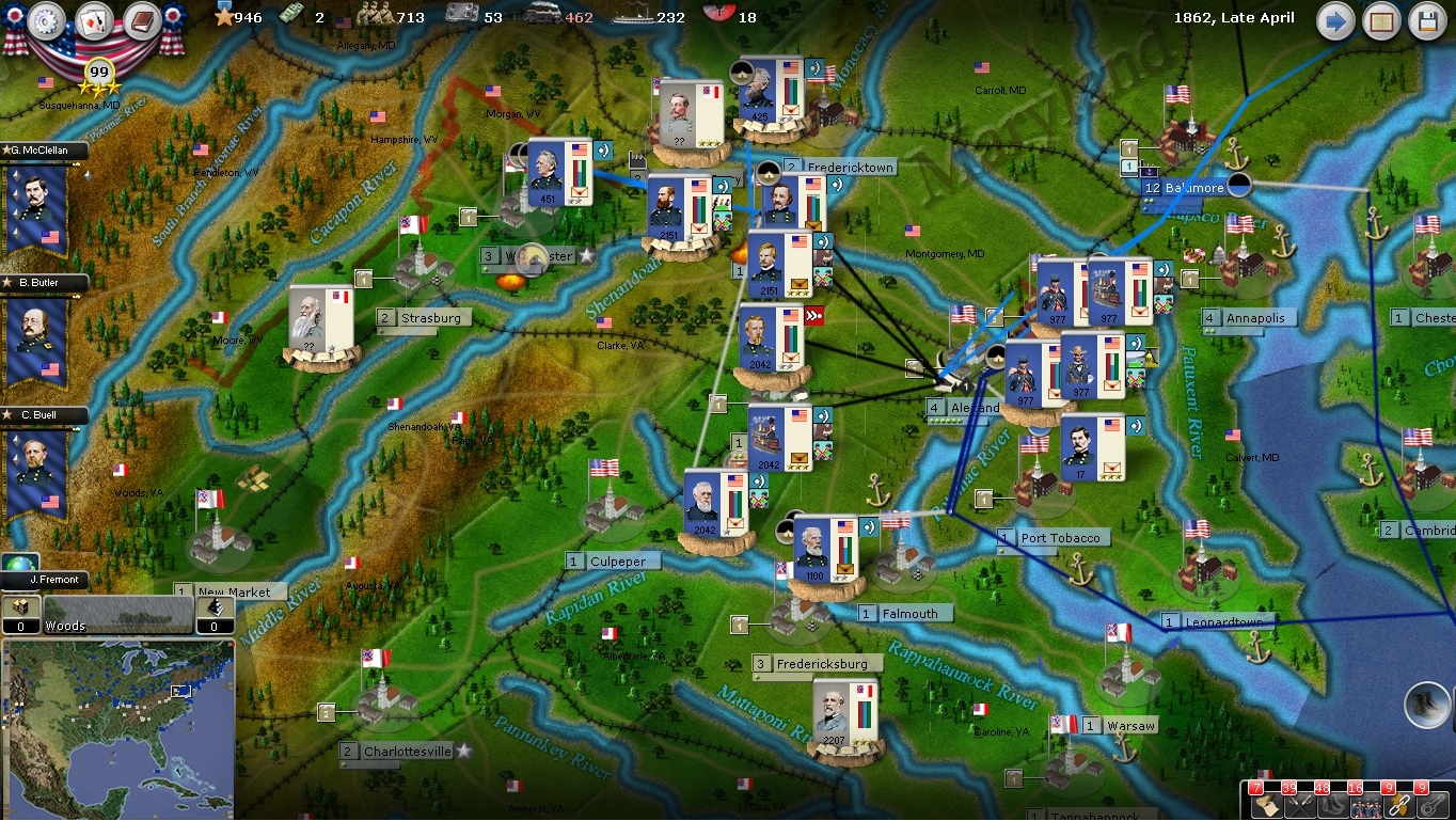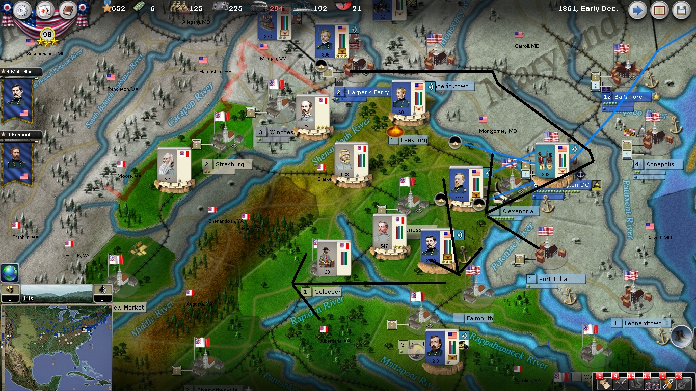 Following the success of General Stone's cavalry raid against Fredricksburg, McClellan is convinced that the right flank of the rebel armies can be turned. Proceeding forward with the army pontoon train and the 4 crack divisions of the Army of the Patomic, Beauregard's army will be cut off from its base of supply in Richmond by a move on Culpeper. General McDowell's army will move into a blocking position in Falmoth. General Banks will leave the defense of Harper's Ferry to a small screening force while moving to hold the Alexandria defenses.