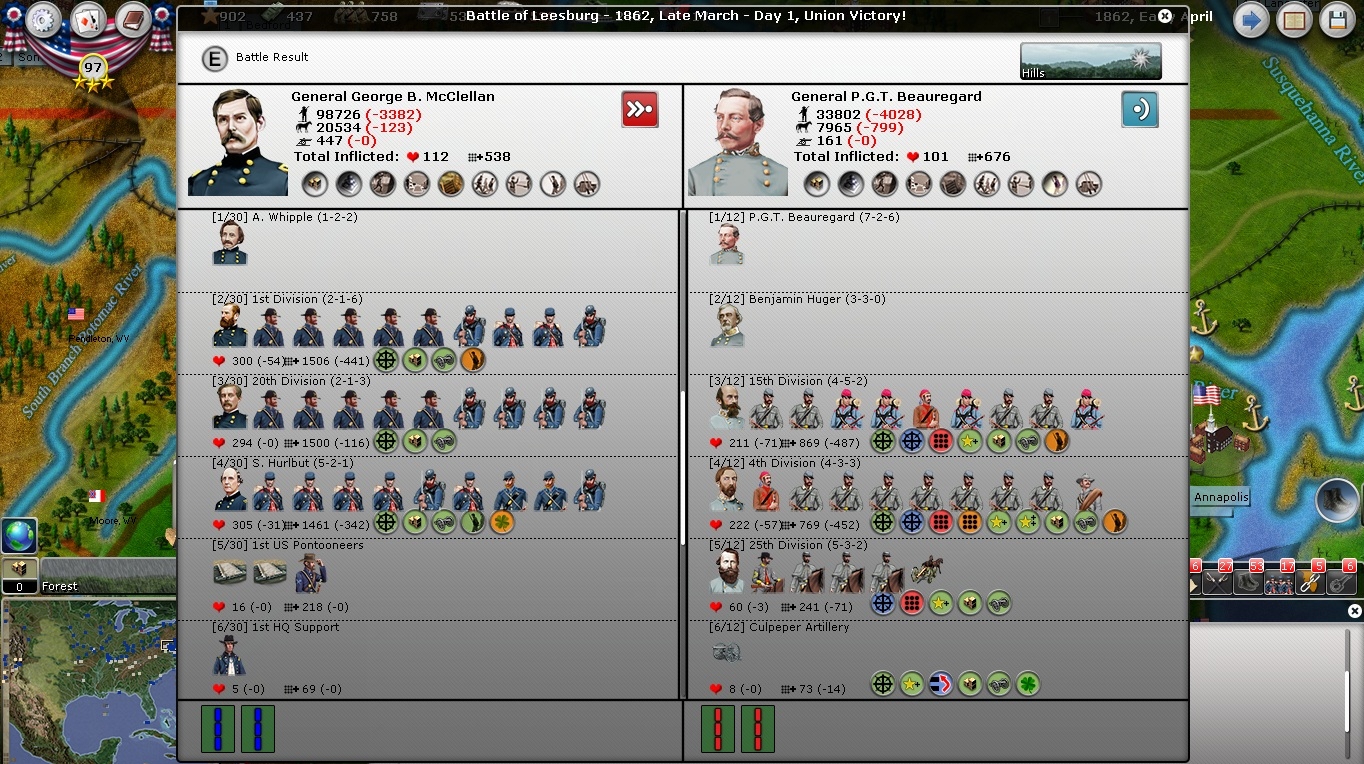 After a month of hard fighting, Beauregard's Army of the Potomac remains intact and defiant. The possibility of a trap continues to exist, but the Union army is beginning to become spread out across all of Northern Virginia.