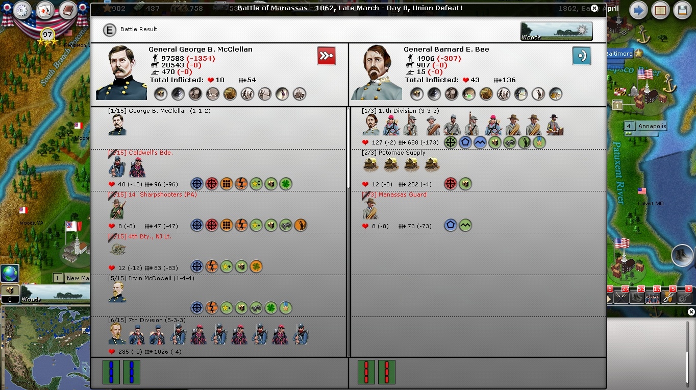 McClellan was in Alexandria going to Mananas. McDowell was inactive in Mananas (inactive and on a defend posture). Bee was in the structure. The screen shot is just of the general battle. You can see that the battle only lasted 2 rounds. Round 1, ONLY McClellan attacked... and his whole force committed and was wiped out, with him getting wounded in round two. McDowell was present, but none of his units committed. And McDowell didn't carry on the fight after McClellan was wounded.