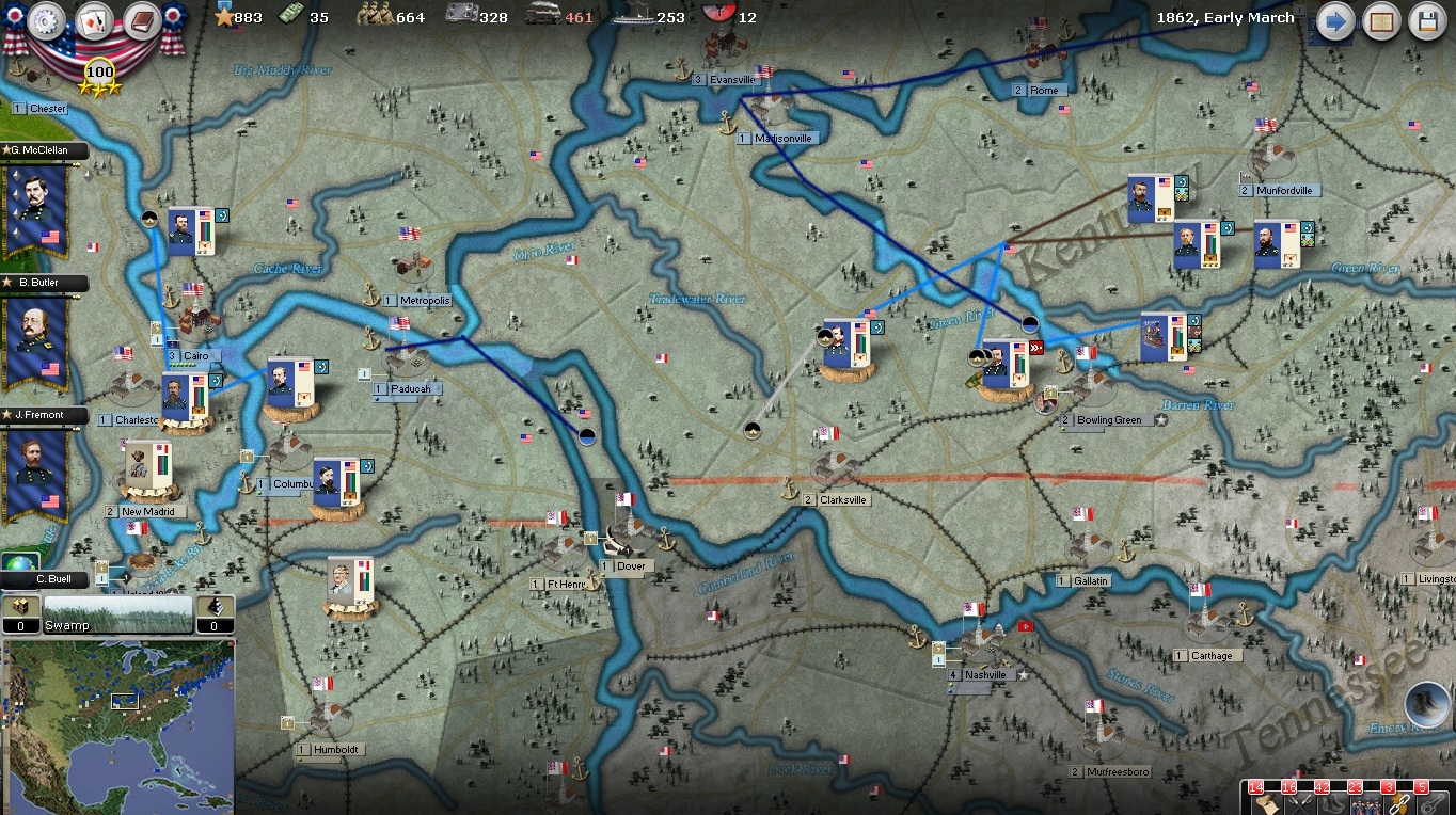 Ft. Donelson: This line of attack is designed to support the Bowling Green thrust by cutting the rail lines across the Cumberland and Tennessee Rivers and using my riverboats to trap any forces north of the Tennessee. The main problem is that to achieve the necessary surprise, an amphibious assault on the Dover region is probably necessary and could be defeated by a moderately large defense force.