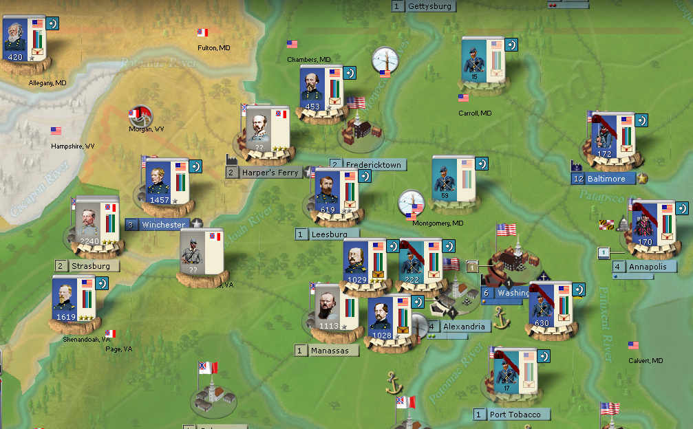 Maybe I’m feeling overconfident from a couple good wins in the East, but McDowell is going on the offensive this turn! Yeah, I think it’s crazy too. But I have identified a weakness in Arrow’s defensive positioning that I hope to exploit and for better or for worse, McDowell’s the man in charge. I’ve been in strength at Leesburg multiple times and Arrow has never reacted by strengthening Winchester. I’ve also never directly threatened Winchester, so it just has a single militia unit twiddling its thumbs. I didn’t think I had the manpower in the past to take Winchester and hold a supply and possible retreat path open while still holding Alexandria; but between the new builds and the divisional formations that has changed. It’s possible that without the need to defend Manassas from a possible suicidal attack and with the introduction of the divisional formations, Arrow will restructure his defensive lines. But 2K strongly entrenched is major overkill for Manassas against poor Union leadership, so I don’t know if he was thinking defensively so much as keeping a strong force consolidated in order to attack. Regardless, I’m doubting Arrow will put enough in Winchester to stop me. If all goes as planned, I should have an army sitting on Arrow’s supply lines to Harper’s Ferry with a strongly entrenched force in good defensive terrain at Leesburg. Hopefully this doesn’t blow up in my face because . . . well McDowell’s leading an offense and that right there is the stuff of Union nightmares and CSA dreams.