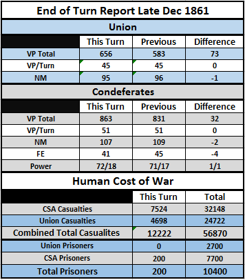 Very costly turn for the South. The total NM change is only 4 NM instead of the full 10 NM that was expected. And it’s hard to beat that kind of a casualty ratio. CSA power dropped for the 2nd straight turn and is down a full 8 points from a month ago.