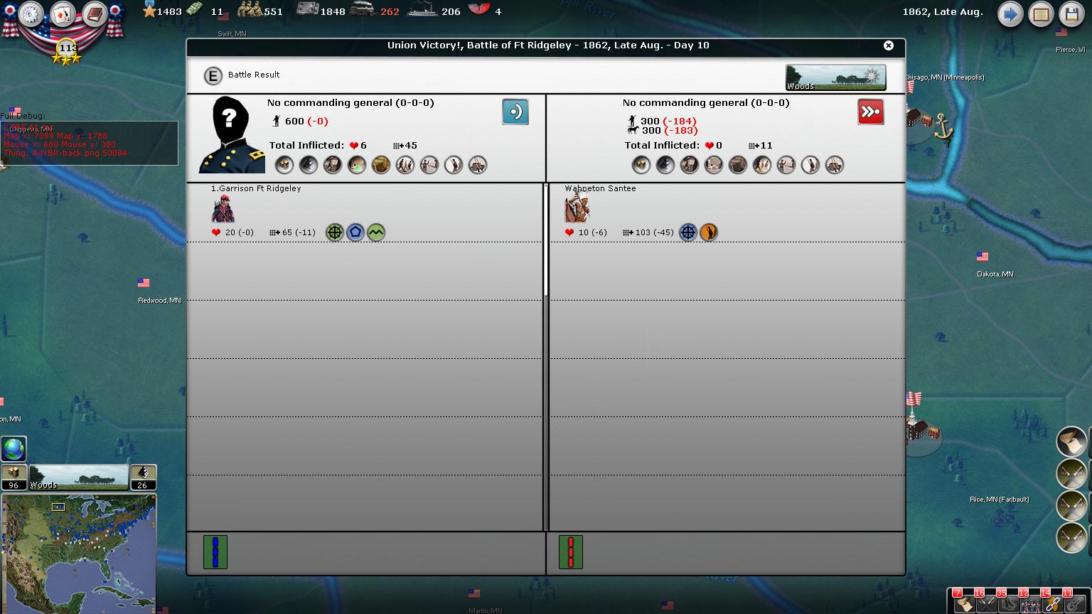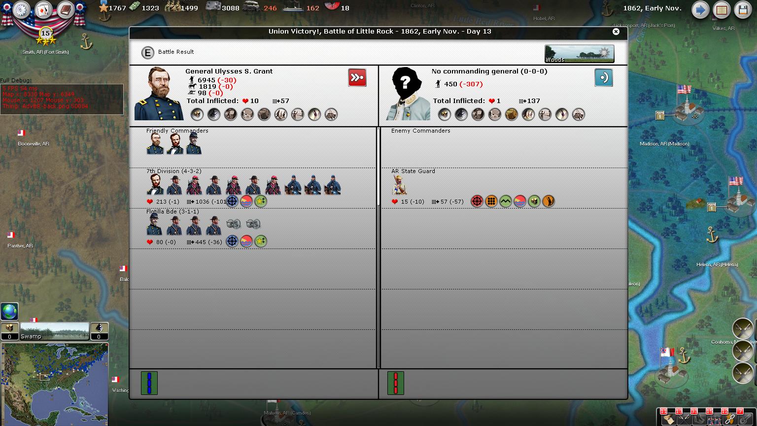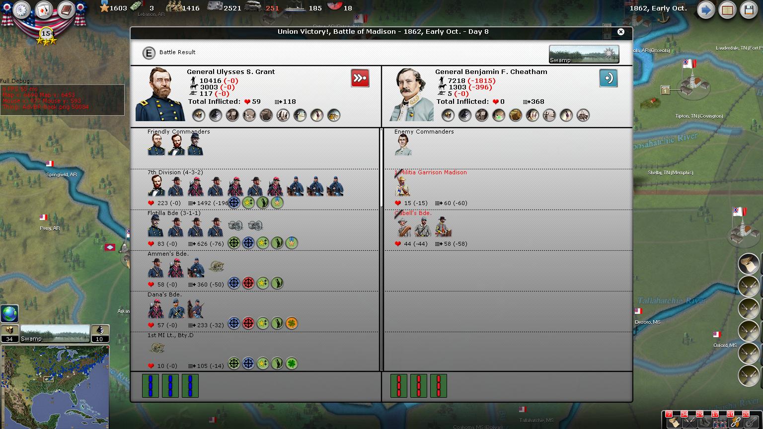 Grant's men made it across the river and linked up with other forces in the AO. Expect ambitious raid to go down the river with gunboat support to attack Vicksburg or New Orleans by going south on the river.