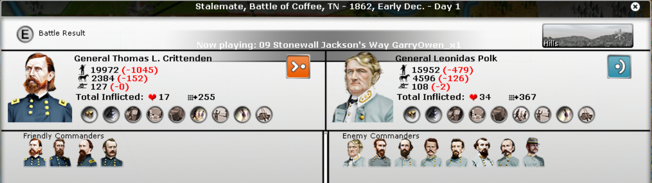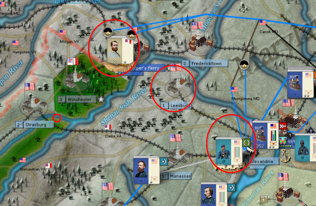 Playing the CSA is tough. If the Union simply does everything it can to amass troops as fast as possible, it can be a challenge for the CSA. The CSA can do nuisance raiding in attempts to draw off troops, but the union can counter that with Cav Divisions and or small corps to deal with it. Where I've seen the Union fail is NM. This is the key. What John did very well is attack in the beginning which drove down my NM. I also attacked which in turn drove down my NM. Where John went wrong, I believe, is that he should have switched to the defensive, especially when he had Johnston and Jackson camped on Alexandria and Harpers Ferry respectively.