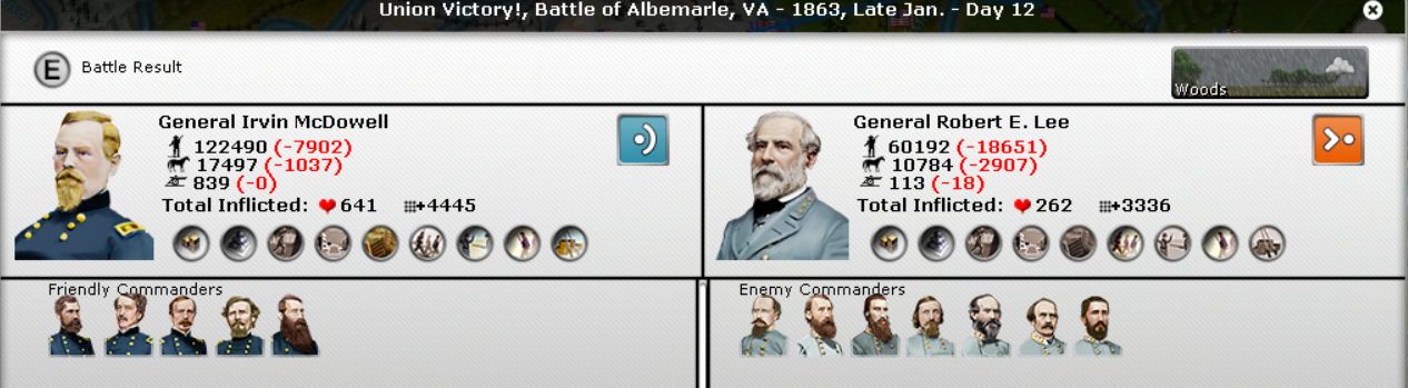The Union leadership is so bad, the only equalizing factor is trenches. As a Union player, I WANT to see the CSA attacking me. I may lose, but it's the only way to equalize the leadership. I don't want to attack because I have crappy leaders who can't attack hardly at all. This is where the mandatory offensives come into play. Yes as CSA it's good to attack and try to take Alexandria down to Harper's Ferry, but the Union has to attack in 1861 and twice in 1862 or lose -30 NM. That's huge and it forces the Union player's hand. So John attacking me when I had to attack him was in my favor. This game models excellently an aspect of the Civil War. Attacking is more difficult than defending. So force the other guy to attack.