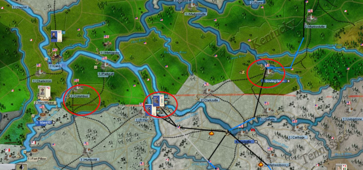 It's really the West that's the major pain in the butt for the CSA because there's so much terrain, but thinking about it, there's 3 choke points. IF these choke points can be held, then it will be much more difficult for the Union to break or use it's manpower advantage. 2 of them are in Kentucky, so I'd be seriously tempted to move into Kentucky as early as possible. I think that allowing Kentucky to remain neutral for a year or more actually helps the Union more than the Confederates.