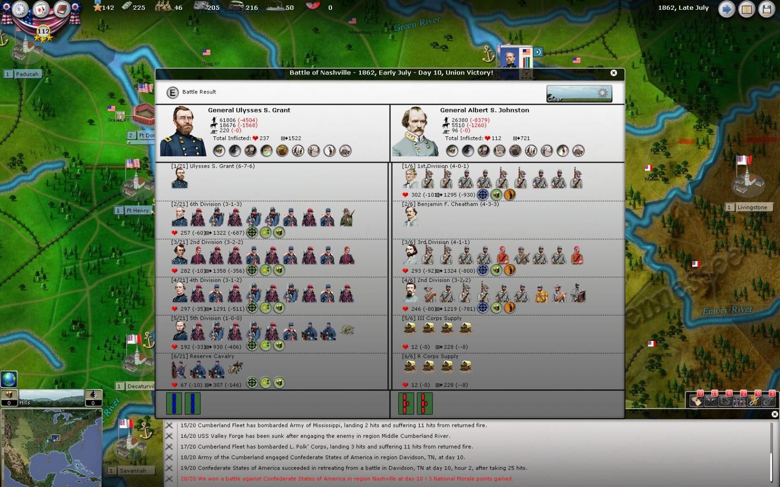 The decision might also have been influenced by the presence of another CSA force that could have been used as a relief force. It might have been interesting to check the AI logs to see if a 'call for relief force' was issued by Beauregard, but discarded by Johnston as he preferred to go to Nashville.