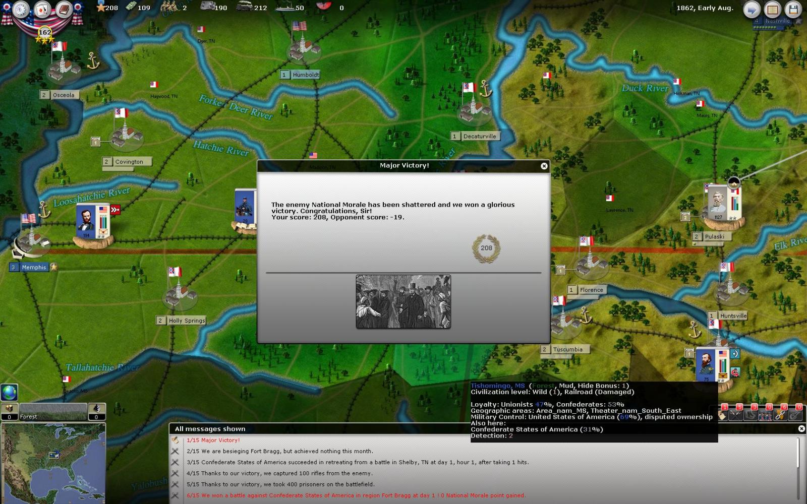 For me a force locking itself in a structure without possible escape, ie not a coastal fort for example, is a big big mistake. Beauregard as a defensive leader should have retreated, simply that. Than Grant must leave some forces facing him instead of just letting units rest one turn and then turn on memphis. I don't know, maybe I am the only one but it seems like such a dumb move...