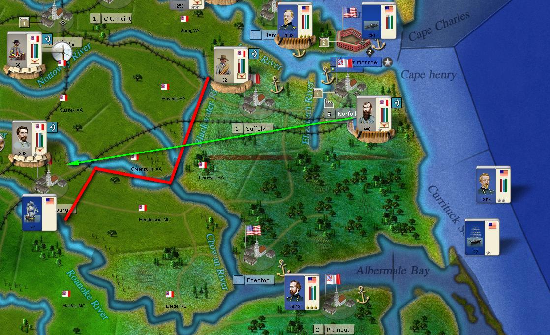 I'm really considering the possibility to attack Suffolk but I'm lacking the needed force to be able to control the line from Petersburg to Suffolk in order to create a Union Pocket. :(