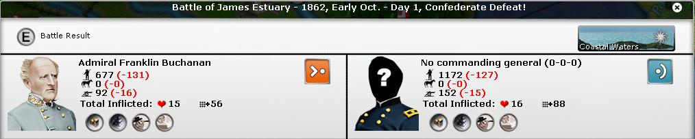 Something strange happened when the Virginia Squadron (Buchanan's force) retreated : it entered Williamsburg Harbour despite the fact its only exit/entry point is the York Estuary ! This is annoying as I was hoping to use the fleet to block movement beetween City Point and Manchester. GrayFox offered courteously to redo the turn or let my fleet move around Fort Monroe without firing at it. But we will continue as if this retreat was correct.
