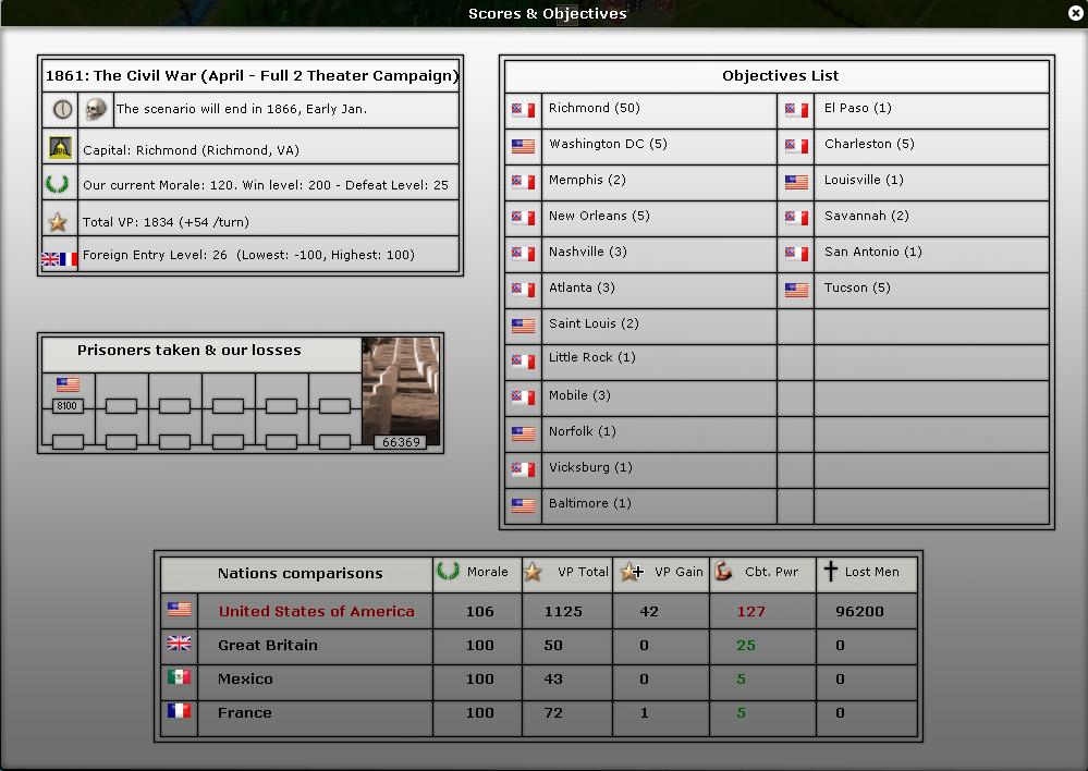 I have 600 more VP but the difference in VP gain/turn has dropped following the entry of the Kentucky into the Union (Bowling Green is Confederate but Louisville and Lexington are adding to the North VP).