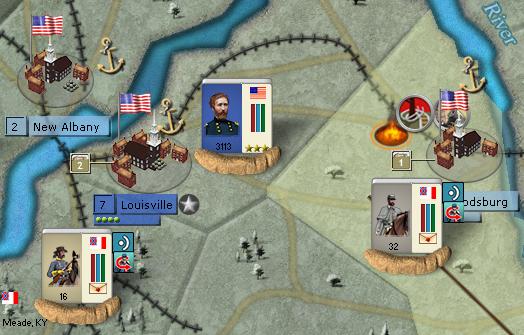 In Kentucky, I'm holding Paducah and Bowling Green and laying siege to Munfordville. Forrest is at Louisville to get more information on the troops holding the city (there is a 500 points force Inside it).