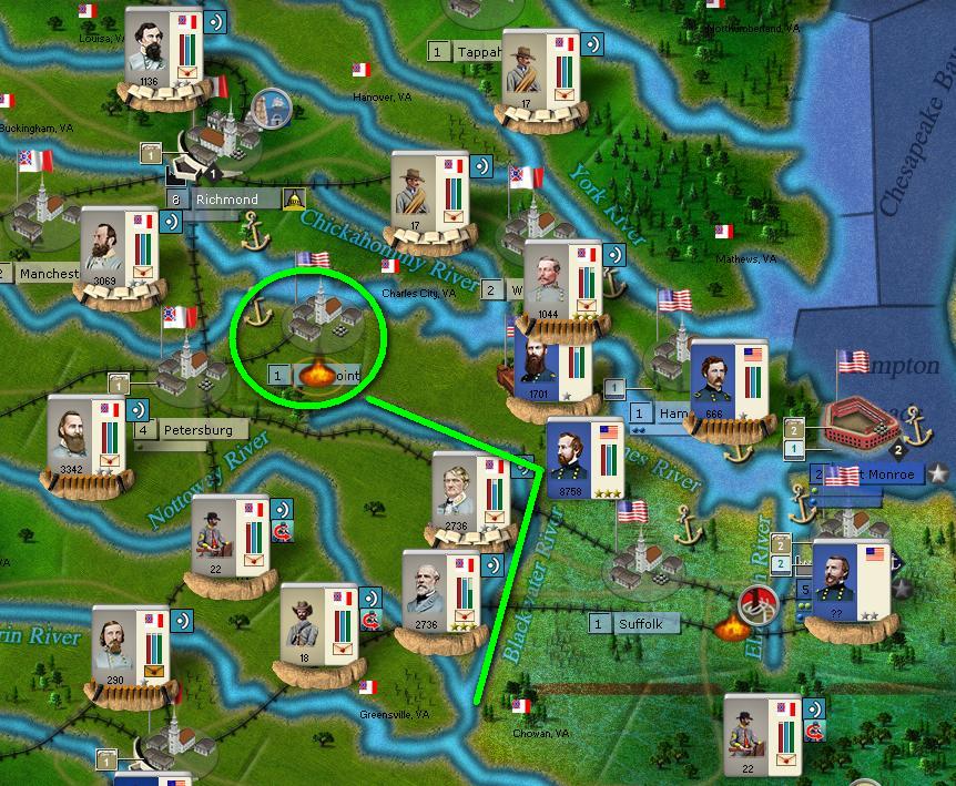 GF is threatening Manchester and Petersburg and has built an outpost in Surry. But there is a weakness in the Union line at Suffolk (and Norfolk is only occupied by a 650 power points force).