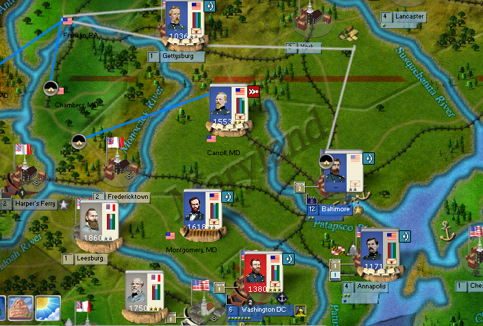 Though it was tempting to hold up for the winter and continue the coastal invasions, I chose instead to attack Alexandria while their trenches were still low. Grant took Alexandria, was beat back by Lee, crossed again, and this time held the beachhead. Sherman shifted over to Washington . A token force holds onto Montgomery under Keyes. That's the least likely spot to invade across due to supply.