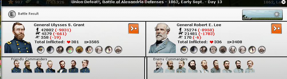 With the arrival of Grant and Sherman, Lee and company elected to not push against Washington. Early September, Grant stormed Alexandria, made 3 start and then in Late September, he promptly retreated from Lee's counter attack. Just enough change in seniority that I'm going to take a hit making Grant Army commander, but in Lincoln we trust.