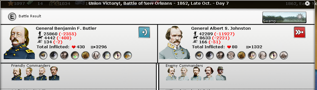 And the combined Johnston/Polk attack. He really must want New Orleans. I personally feel that New Orleans doesn't mean the end of the war for CSA nor does it mean take it back at all costs. It's very difficult for the Union to expand from New Orleans. The weather and terrain are terrible and the CSA Ironclads make river invasions a challenge.