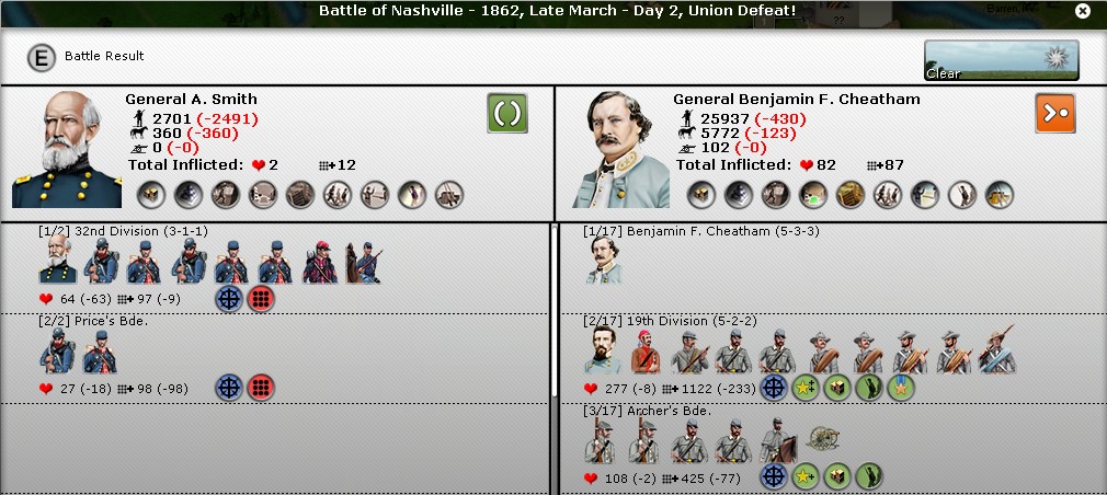 Day 2, Cheatham caught my retreating forces from Nashville, punishing them good.