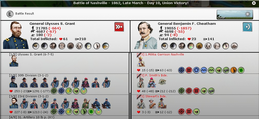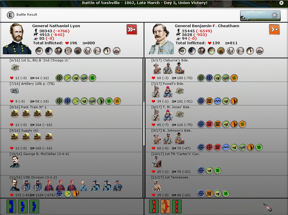 The battle report shows my victory on day 5. It does not show how close it was. I had to look at the slider showing Lyon outnumbered for 3:1 in the first round of combat. Then active! McClellan MTSGed ! on round 2, than finally in the last round inactive Thomas showed to finally convince Cheatham to retreat.