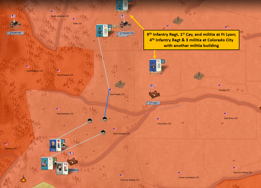 [color="#008080"]FAR WEST:[/color] Once again Carson’s inactive and a misclick sent him chasing some rangers I had move further north. The good news is that no further units were caught by Shelby and Taos has burned to the ground. I also have enough supply for everyone at Ft Garland for this turn at least. I still have stragglers set to arrive within the next two turns. Unfortunately, Shelby has continued his relentless pursuit. If I could catch a breather, I think I’d be fine now as most of my force has consolidated and are mostly in supply again. I’m going to try to make a stand at Ft Garland and hope the hills, harsh weather, & deep cold all contrive to help me fend off Shelby should he try to continue to move north. Unfortunately, this turn I can’t see the condition of his cohesion or supply. Fingers crossed that he breaks off pursuit. Remember, he is leading a division of grunts and cannon, so he can’t just sprint south back south to restock. Unfortunately, it does appear that he has a supply unit and cavalry trailing behind his main force, so who knows if he’ll continue pressing north or not. My half stack of cavalry relief force continues to move west with the clearing of Nebraskan weather.