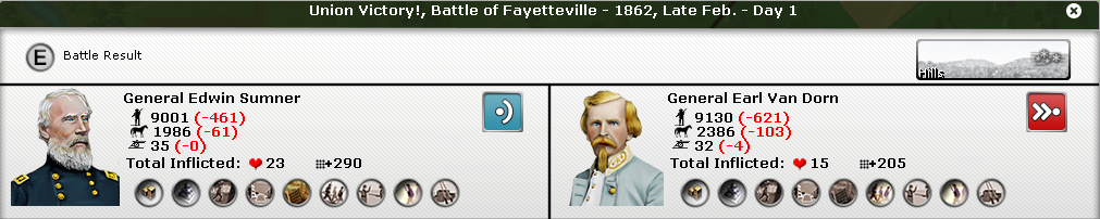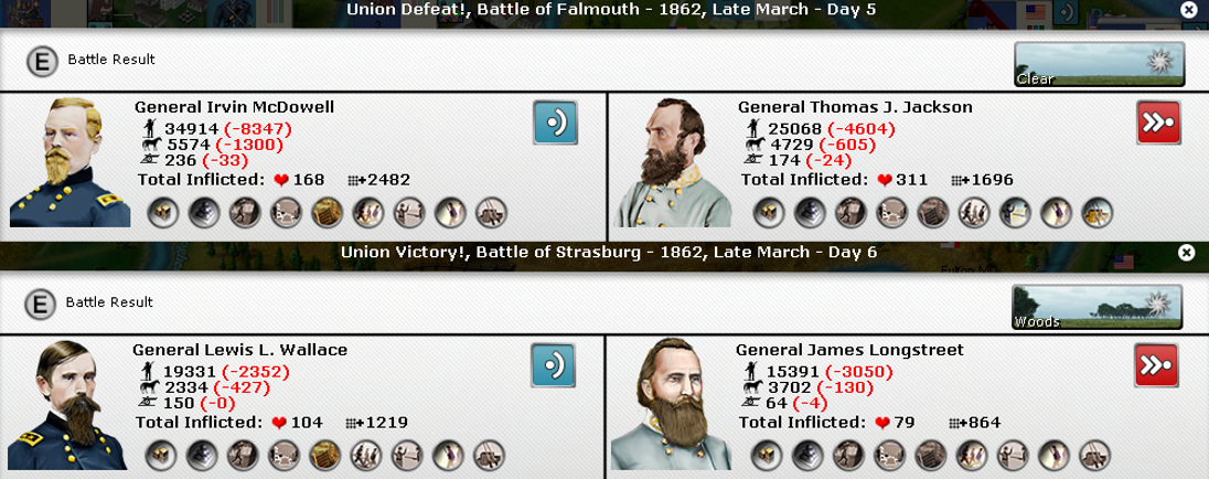 [color="#008080"]OVERVIEW:[/color] Rebel forces are on the march in Virginia and Tennessee! Multiple corps level attacks are launched under the direction of General Arrow in an attempt to reclaim his sacred soil. In Virginia two attacks are launched on the Union flanks, with mixed results. Additionally in Tennessee, the attack on Humphreys is easily repulsed. Union forces land in Savannah, GA and quickly take possession. Rebel demonstrators start trying to build support in four Northern cities and counter intelligence operatives are quickly dispatched to all four cities. Former 1* Phil Kearney is promoted, famed indian-fighter General McCook is available, and the elite Eagle Brigade forms up.