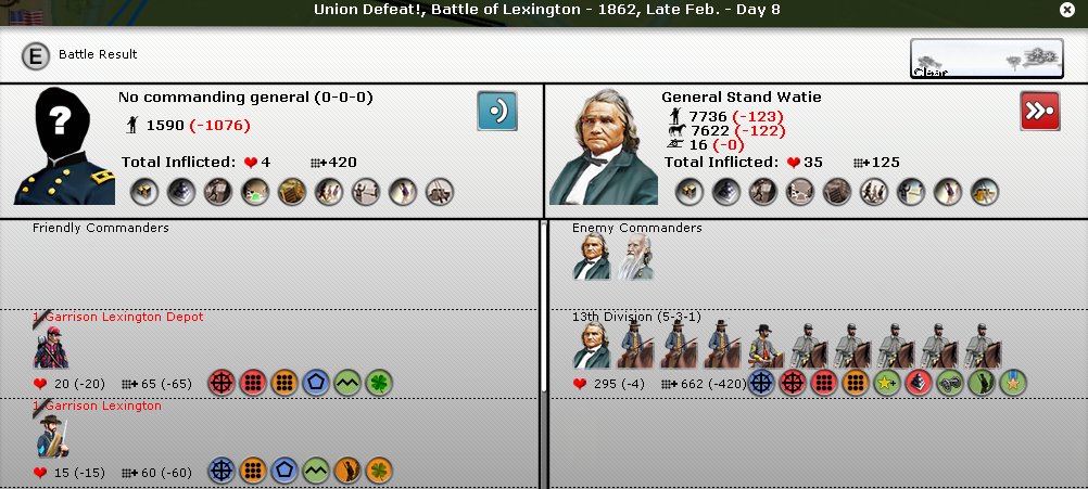 [color="#008080"]TRANS-MISSISSIPPI:[/color] The break in weather was brief and now Watie’s division is just west of Lexington with harsh weather closing in on him. The depot at Lexington is scheduled to burn and should be gone by the time he pushes my militia out. He should still get his hands on lots of supplies. In cases like this, I wish we had the option of either destroying all supplies/ammo or being able to have all sundries possible pulled out of a city. Supply suddenly became very crucial for Watie’s division because Fayetteville is now mine without a fight. I’m not sure what ROE Van Dorn’s division had, but they did not contest Summer’s division when I moved in. Both divisions are still present and now are staring each other down but with Union possession, the onus is now on Arrow to either attack me or vacate the region.
