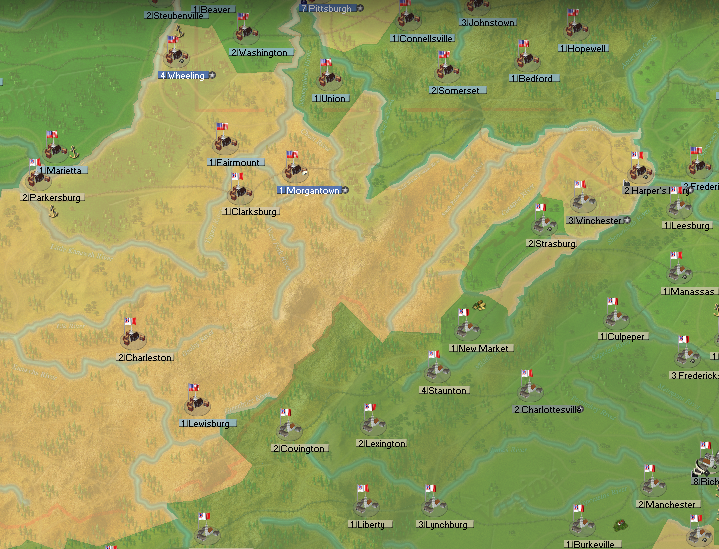 This decision is not without downside though, and it could potentially be a really bad one. Alexandria will be vulnerable if he has plans to move in that direction this turn. I could be wrong, but if he assumes I’ll rail out, the logical destination is back to Alexandria. I’m hoping he’ll assume that’s where McDowell will end up and will choose not to attack a strong defensive position. After all, who would choose to leave such an important position open when it’s right next to 2K power worth of CSA troops led brilliantly by the likes of Jackson, Longstreet, etc. I could be over thinking this though, so we’ll see what Straight Arrow does. To help lessen the risk, I’m bringing Hooker’s as of yet incomplete division as close as I can without any disloyal regions ferreting them out. Additionally, I’m pulling a couple units from Montgomery as it’s covered by McDowell’s presence at Leesburg; a couple more from my two positions opposite Harper’s Ferry; and most of the cavalry units I had covering the area north of the B&O railroad as that threat has lessened. Not including the locked garrison, that should give me around 17-18K soldiers and 90+ cannon there by the end of the turn. Those numbers along with the level 4 entrenchments should make any attack pay a heavy price for any real estate. Build in this theater are the usual transports, infantry regiments, support units, and an artillery battery.