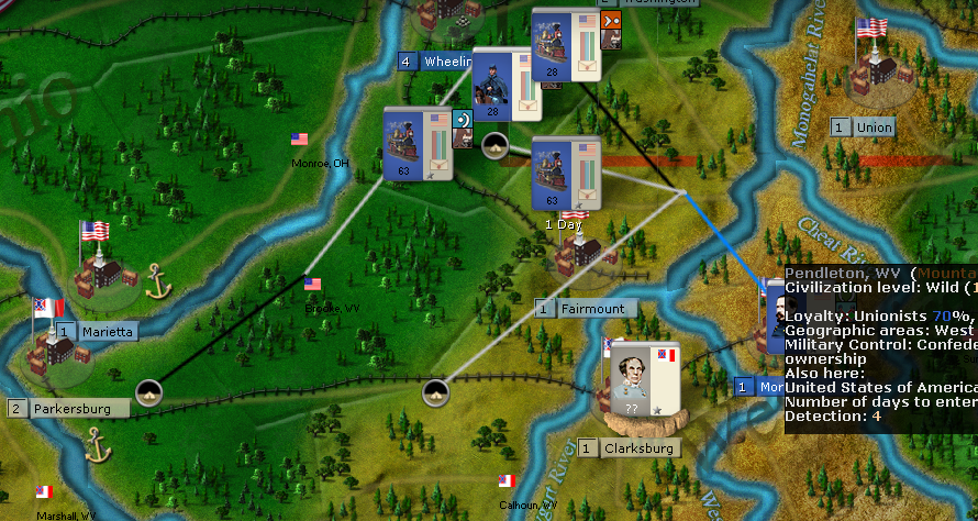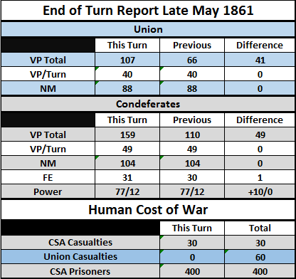 [color="#008080"]EAST:[/color] McDowell railed to Leesburg as planned and was able to bring a single cavalry regiment to battle and proceeded to kill/capture the entire regiment. That’s 600 fewer cavalry troopers I’ll have to worry about. The cavalry units I sent to Falmouth pushed out the enemy cavalry regiment there without battle. Half my objective wasn’t accomplished as no casualties were inflicted, but I only see 1 militia unit in Culpepper with a battery en route to Manassas. In Fredericksburg the defenses are a little stronger with 2 volunteer brigades and the locked militia unit holding that crossing. It’s early and I’m assuming Arrow is doubling down on his defenses in Manassas in order to ensure my NM takes a hit. But Manassas is a little exposed, it could be easy to surround that position if Arrow’s deployment doesn’t change. I lack the strength and leaders to exploit it now, but I’ll be keeping my eye on his position.