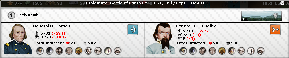 [color="#008080"]FAR WEST:[/color] Arrow somewhat surprised me as he was able to get his force to Santa Fe by moving through the region south of Santa Fe first. I’d forgotten that Shelby has the fast mover trait and so I didn’t enjoy the advantage of defending against a river crossing. Still, my militia gave a good account for themselves even without enjoying the river malus Arrow avoided. The casualties were slightly in his favor, 584 Union dead to 522 CSA dead. But comparatively, I only lost a little over 10% of my force while Arrow’s losses account for close to 20% of his force. The battle was a stalemate however and I expect it’ll pick up again next turn.