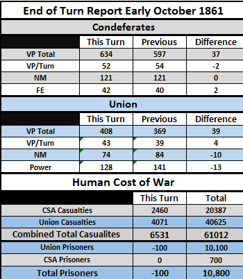 [color="#808080"]OVERVIEW:[/color] Clear weather in DC! Johnston prepares to lead the Army of the Shenandoah against Washington DC. Confederate forces lose battles in Bowling Green, KY and Erie, MO but win a key battle at Manassas. Demonstrations fail to take in Boston and are countered in NYC, both will be re attempted.