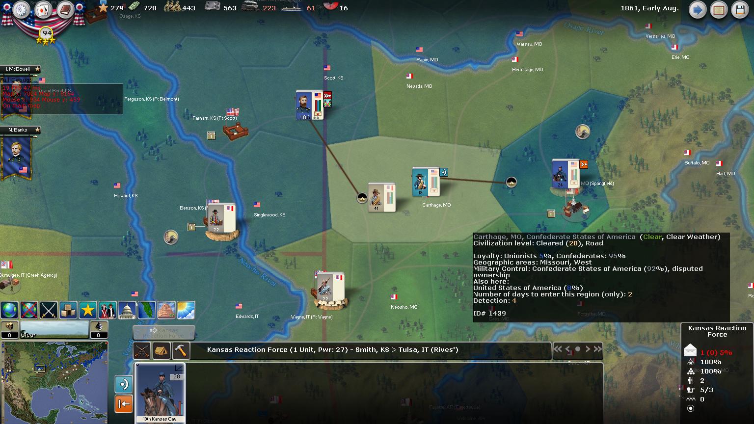 To get the upper-hand in the far West, we will build forces and sweep through New Mexico and into El Paso which is a strategic hold. Tuscon is also a possible city to invade in the near future.
