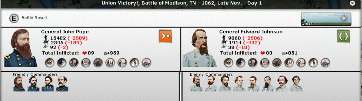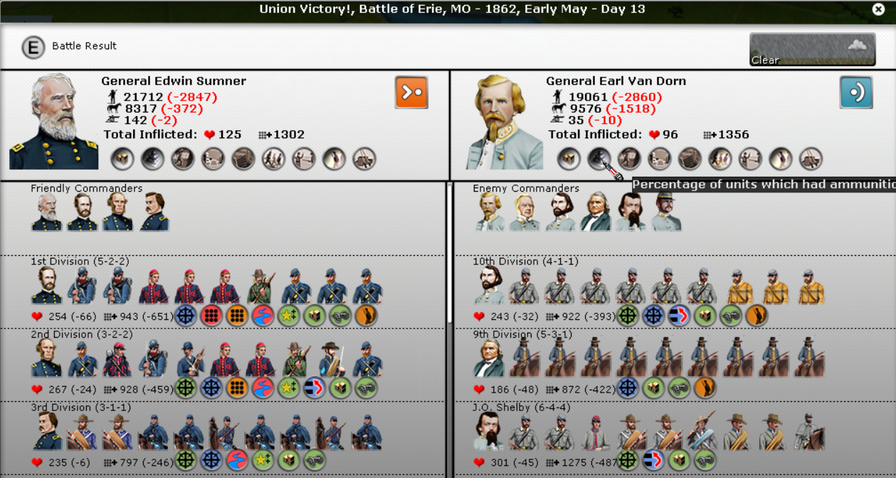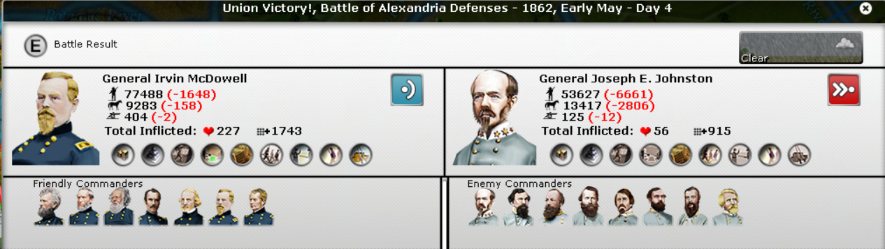 To obtain both objectives, I'll need 5 division under McDowell. in Alexandria 4 Divisions under McClellan in N. Virginia in Harpers Ferry. 3 divisions under Grant. All future builds will be 2 division on the East for 1 division in the West. If I'm able to hold the Alexandria -> Harpers Ferry Line, then all Eastern divisions will start doing a maneuver game in the East. I'll probe the lines and force reactions. This should loosen up CSA defenses and enable opportunities. If I lose the line and get pushed north of the Potomac, then I'll defend the northern side of the Potomac and start forming Corp for invasion along the CSA coast.