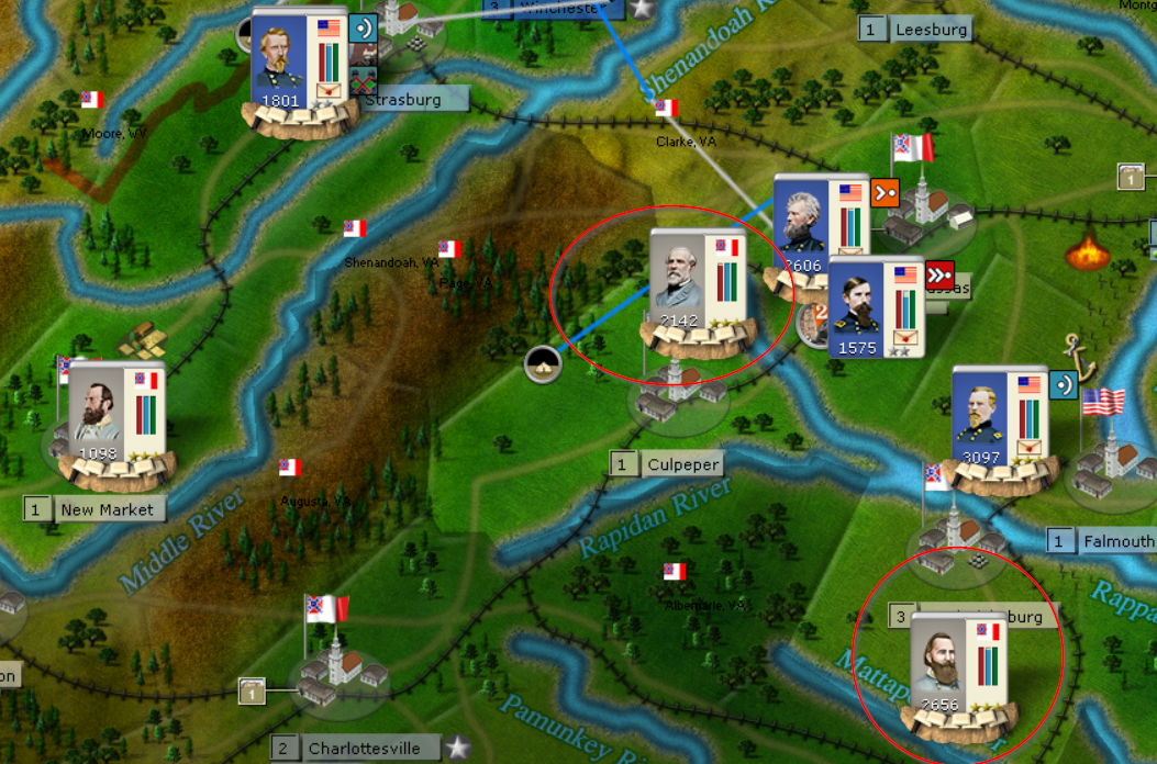 We'll see of the CSA complies. My goal in the East is to hold the line from Harpers Ferry down to Alexandria. For me this is a critical objective. If the CSA is able to get that line (3 regions), the Potomac enables mutually supportive corp to easily defend that line and the CSA can start pulling divisions off the line for use elsewhere. If the USA can hold that line, then the CSA has a much larger swath of land to defend. From Falmouth, Manassas dwon to Winchester must be held. 5 regions vs. 3. A very big difference and the USA can play small ball and start moving corps into the open regions in order to force either CSA response or a pull back. This is the difference between holding the strategic initiative vs. losing the strategic initiative and pure defense.