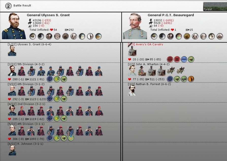 Ace wrote:... In this case Beauregard didn't actually take part in battle because he was inside Corinth, and although senior commander, battle was for the csa commended by Wharton. That is why you are not seeing his stats.