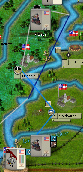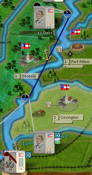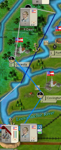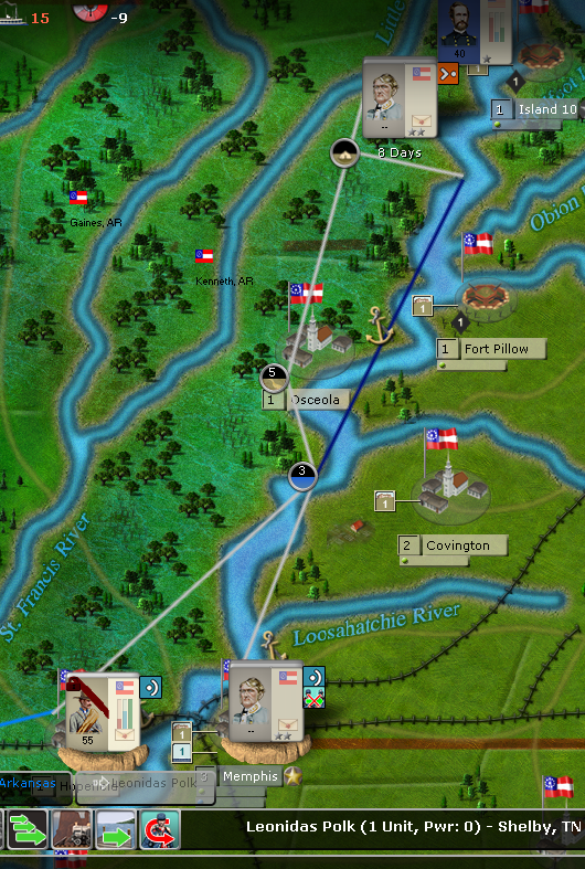 So, I just received Polk (just became active, at least). He starts in Memphis, as we all probably know. I want to get him up to Reel, MO/New Madrid, where Athena is pushing Nathaniel Lyon's Force on me.