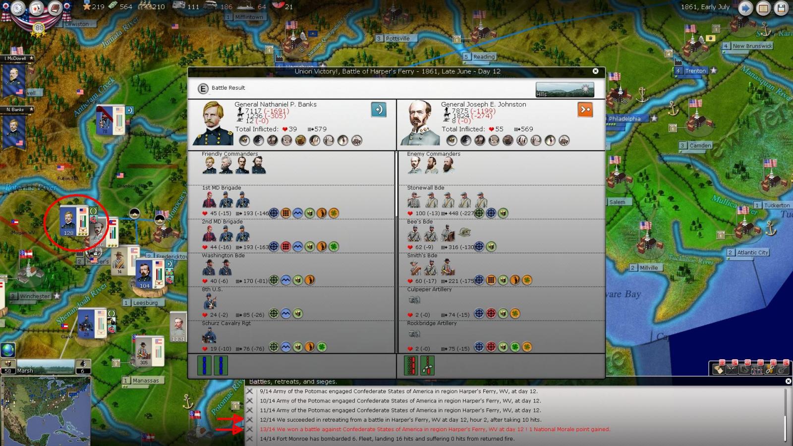 Everything here points to a CSA victory in the battle though. The Confederates inflicted more hits and forced the enemy stack out of the region. To me that should equal a victory. How else is a victory defined other than casualties and ground taken.....