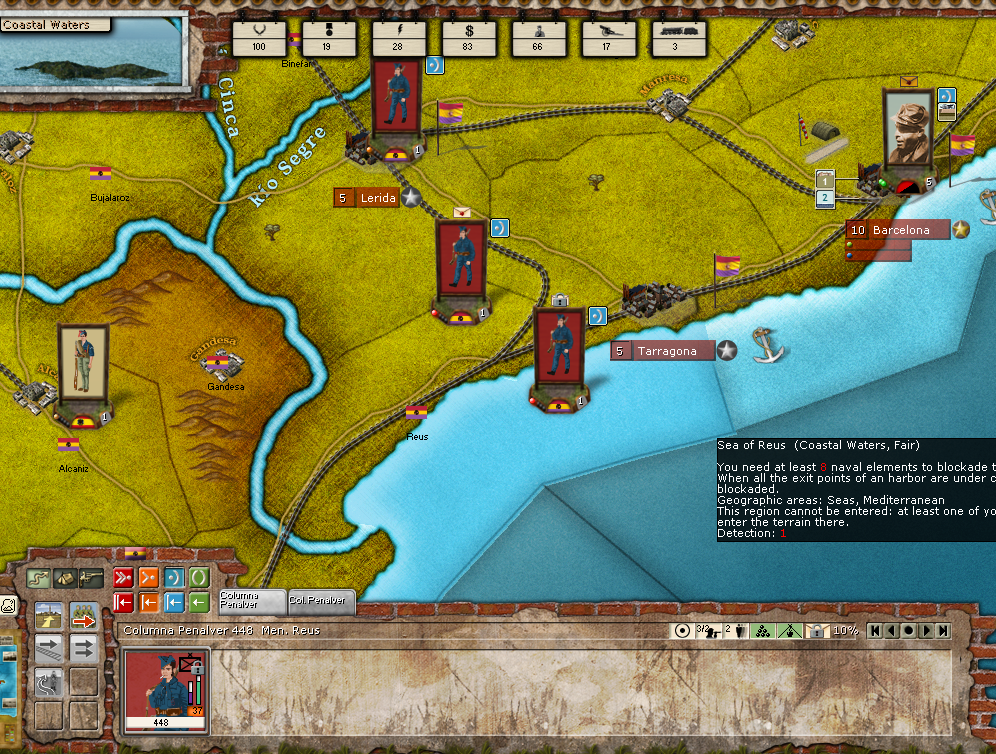 Interestingly, the frozen version of the Columna Penalver appears on the sea zone adjacent to Reus rather than on the region itself. When attempting to drag and drop it on the Reus region (where it's supposed to be), it doesn't move.
