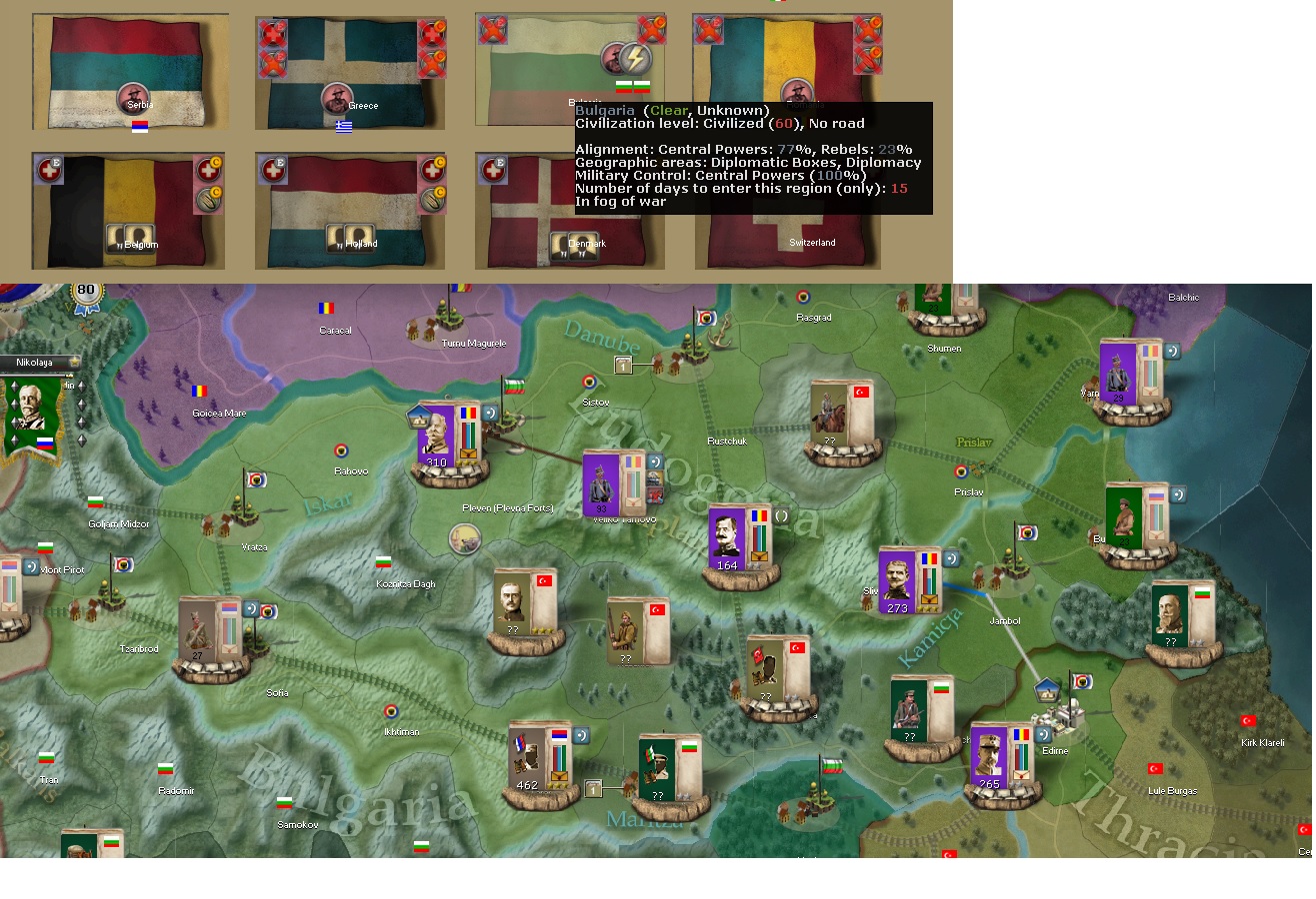 Kensai wrote:The thunder icon you see in their flag means they have lost their capital (Sofia). I believe that in a future patch we could have countries lose alliance alignment (gaining towards Rebel sentiment!) much faster when they have lost their capital. This will be the best of both worlds: yes a country won't last long, but if it had a good alignment beforehand it won't crumble immediately.