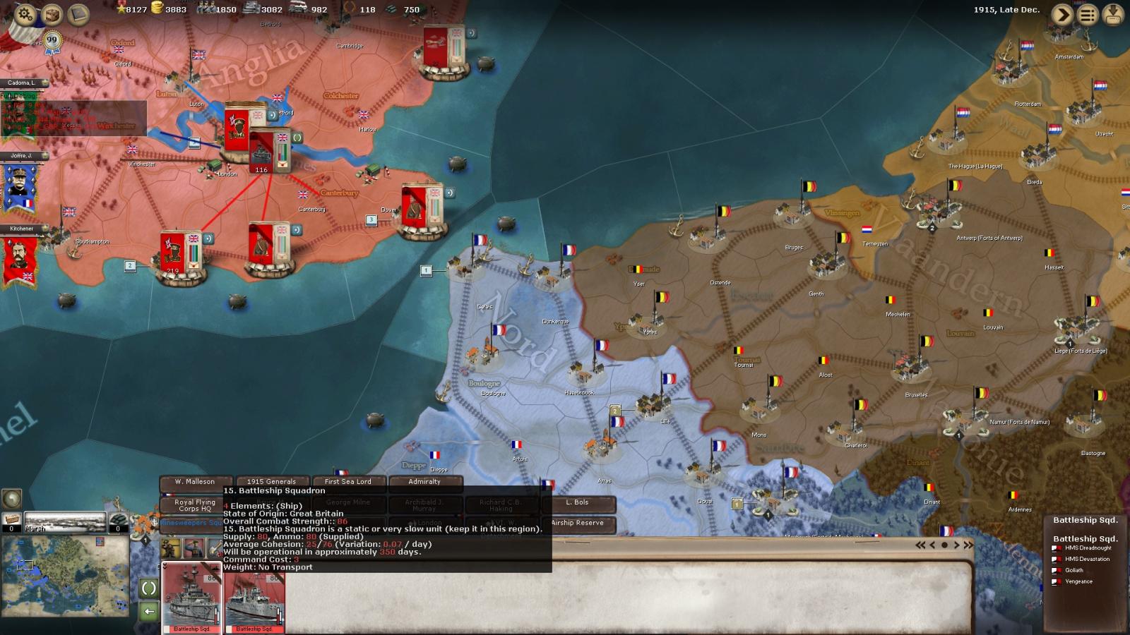 Also, with the way the game handles stacks, this would work well. Both the british and the germans used 8 unit divisions for the battle lines. A leader + 8 one element units would make a stack. It would give more reasons to have more naval commanders, especially if stacking was turned one for naval units.