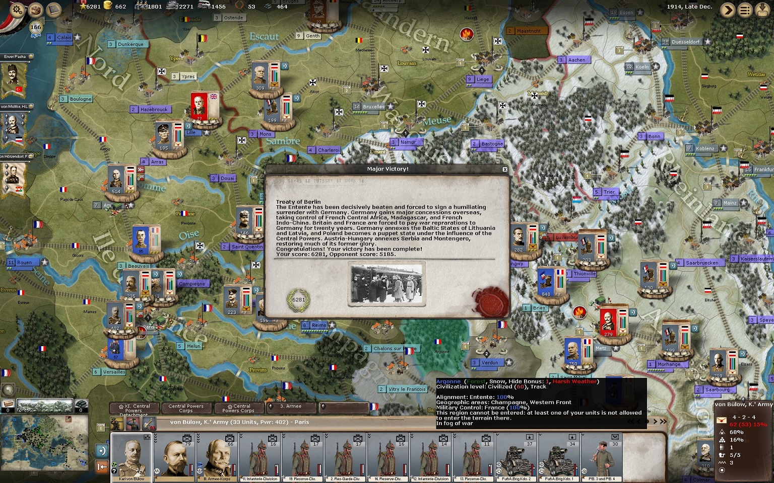 i managed to get a major victory by late december 1914 against the AI by taking Paris! See the screenshot. I did a hard rush through southern Belgium and the Ardennes. The french created two super stacks (around 2400 combat power each) and attacked Metz. They were repelled each time, but with heavy losses on both sides. I play without detection bonus. The russians crossed the border to Germany on several locations, but did not manage to take any important german city. Against the Austrians they were more sucessful by taking Lemberg. On the other hand the Austrians managed to take Belgrade with only one Army (under Potiorek).