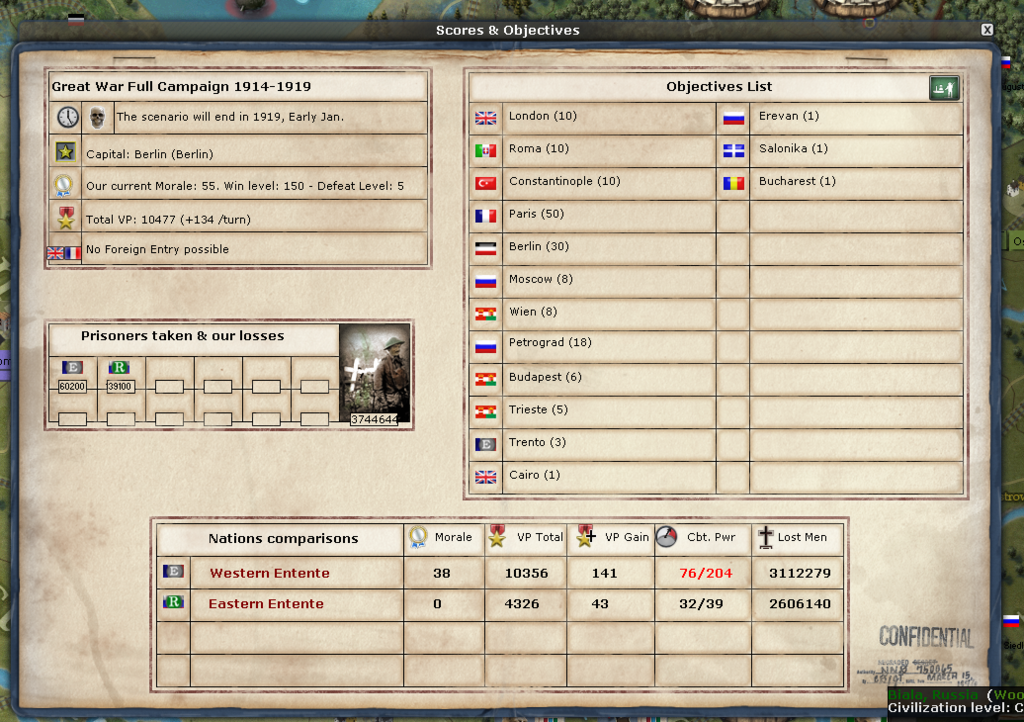 Another potential issue has surfaced in the same PBEM. It is late July 1917 and Eastern Entente reached 0 morale in early July. The second straight turn it shows EE morale at 0 - but no surrender. All EE units (Russia, Romania, Serbian) remain in the game and active.