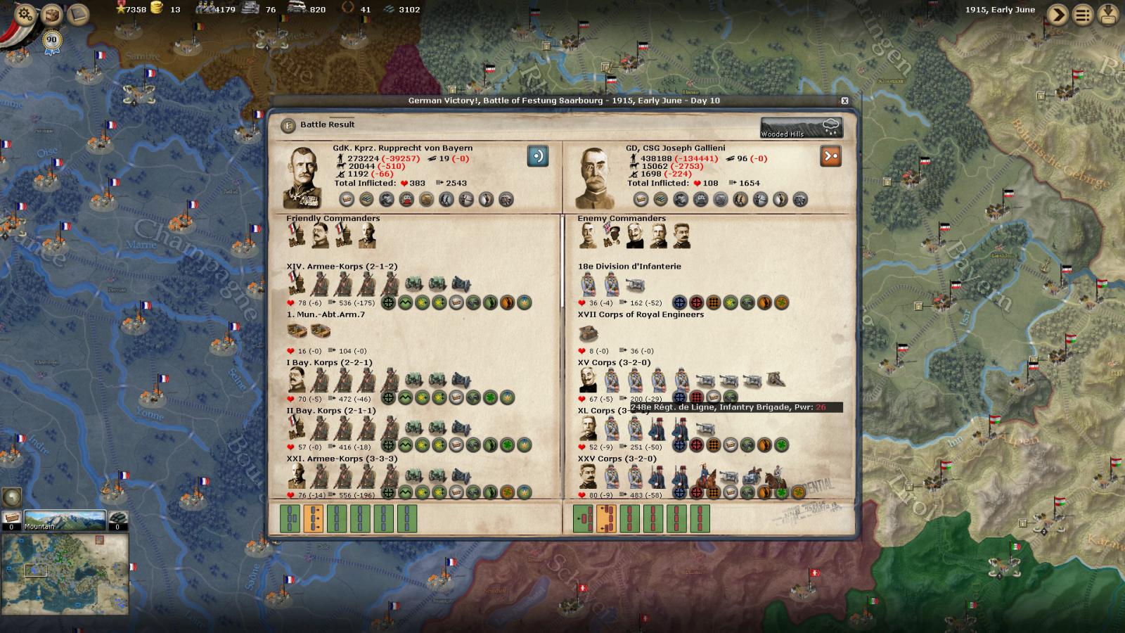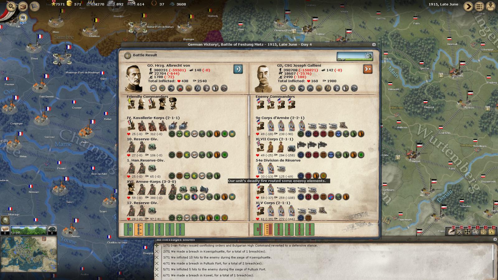 3. the AI attacked with inferiority in planes, guns, men and horses which is "STUPID" in terms of WW1 battles. You have 20% more men and 6% more guns (also better quality or more powerful guns), you have a strong fortress (giving you entrenchments) and the enemy has penalties (river crossing).