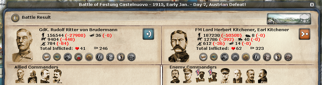 The BEF just invaded Cattaro in my PBEM. On the first turn they win a battle against my Austrian force which has also just arrived in the same turn to defend the region. Here is the battle result: