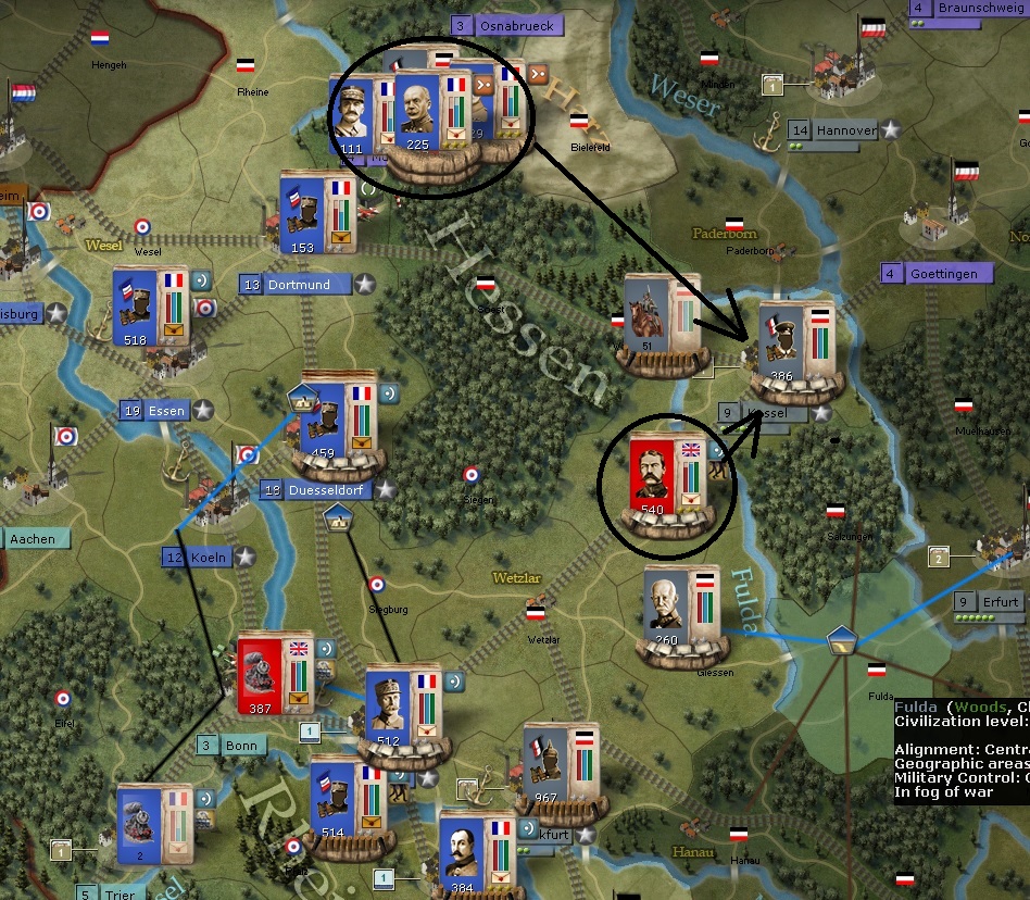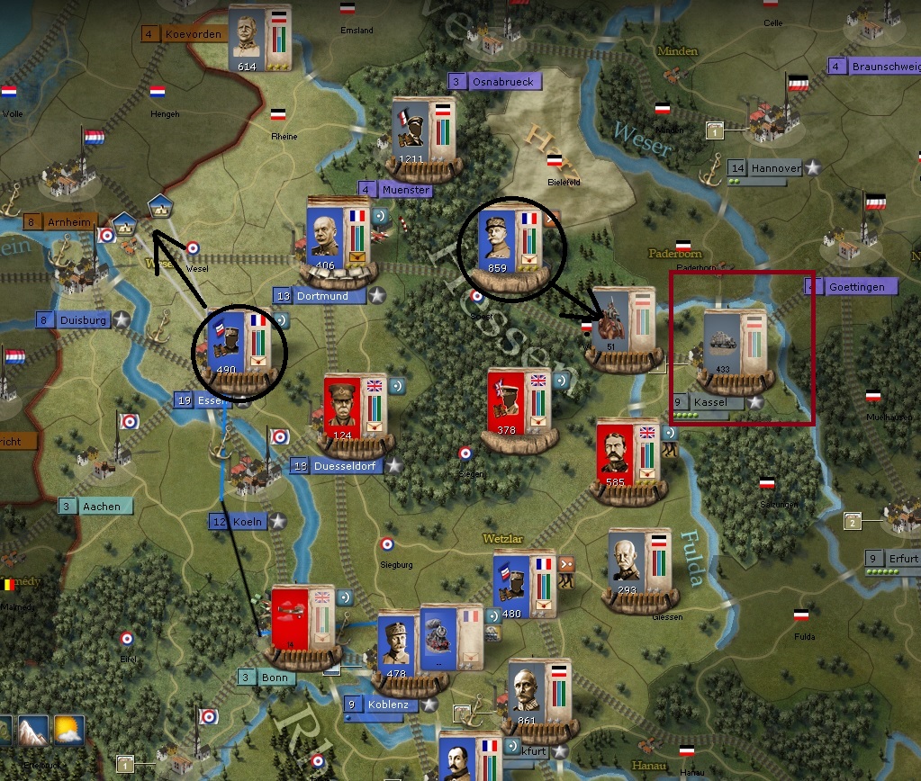 I'm moving up units all over the Northen Western Front. Kassel is in the red box and you can see how threatened it will be when Foch moves down.
