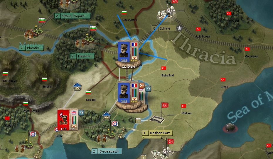 I'm taking another British corps to the Salonika region. There are 3 militia units there in Edirne and around. I think they are Bulgarian. They are dark green.