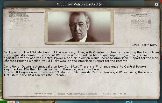 And Wilson is re-elected. I am unsure what difference it makes at this point, since the USA is already in as an ally of the WE. But, I suppose it cannot hurt since Wilson was more for war than his challenger.