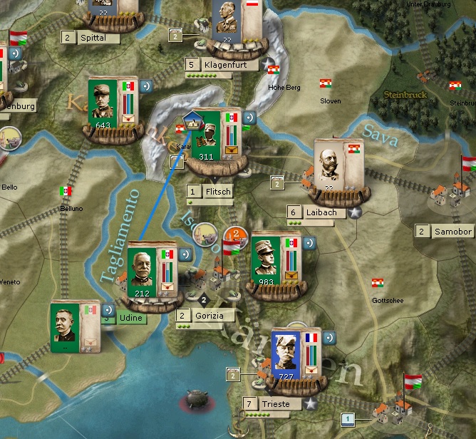 Italian Front....Black circles are assaulting Innsbruck. Blue circle - a formation moving up to help assault Sachsenberg. Yellow circles are the Trieste battle area. I am moving up supply and Generals and I am hoping to get an activation so I can assault Trieste soon. Orange is the Laibach area. I am trying to think if I want to take the Laibach formation East and attack Samobor. Would I be too exposed? I don't know.
