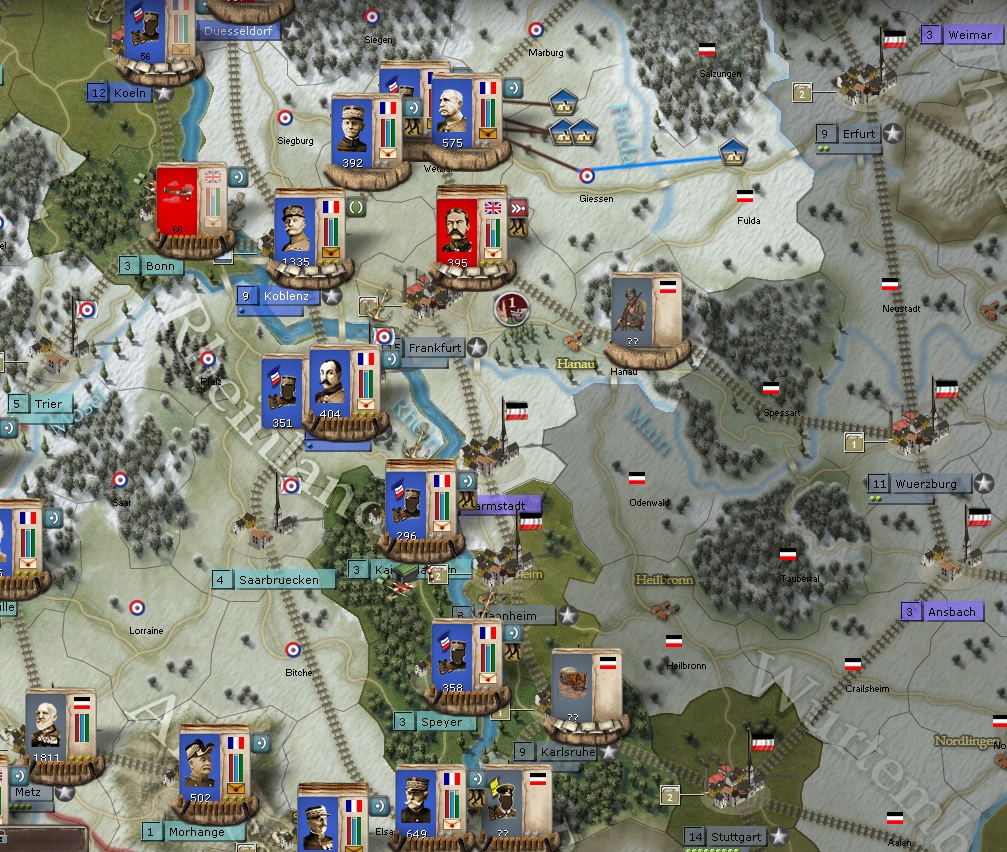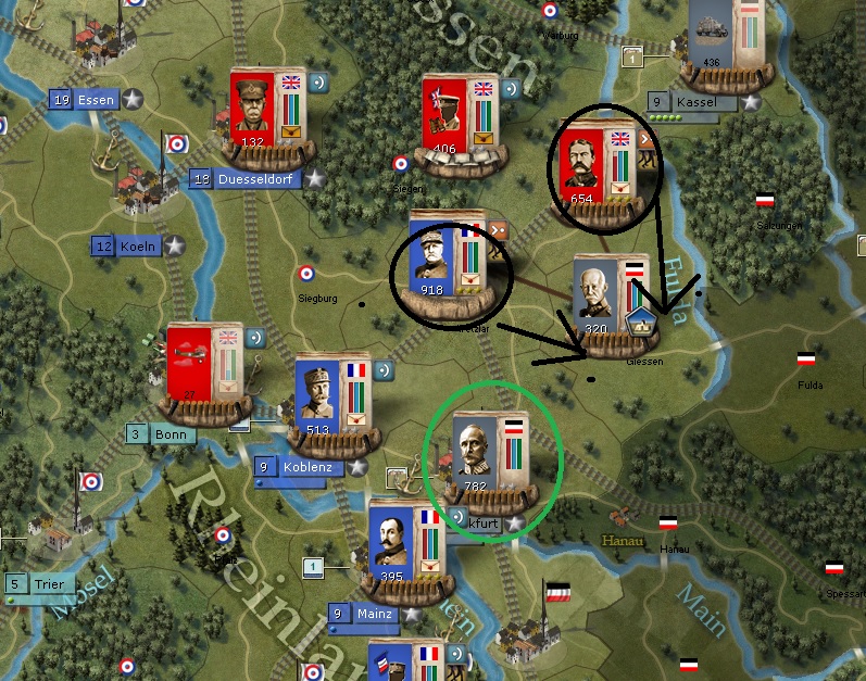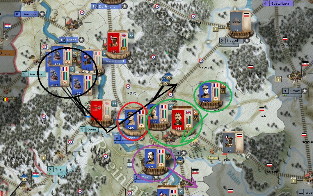 West Front North. I've already posted this, but I thought I would explain it more and add some arrows of movement to see what I am doing. Ok, in black, 3 or 4 units from that large, oversized formation are now reformed and moving East - Well SE then NE. In RED circle, Foch is resting and recuperating from the loss a couple of turns ago. GREEN circle is General Lord sieging Frankfurt, and then I am showing Castelnau moving down SW to join the siege of Frankfurt.